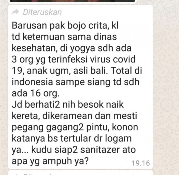 NARASI:Barusan pak bojo crita, kl td ketemuan sama dinas kesehatan, di yogya sdh ada 3 org yg terinfeksi virus covid 19, anak ugm, asli bali. Total di indonesia sampe siang td sdh ada 16 org.Jd berhati2 nih besok naik kereta, dikeramean dan mesti pegang gagang2 pintu, konon katanya bs tertular dr logam ya… kudu siap2 sanitazer ato apa yg ampuh ya?