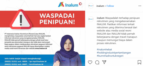 Maraknya informasi seputar lowongan kerja yang mengatasnamakan PTnya, PT Indonesia Asahan Alumunium (Inalum) pun memberikan himbauan kepada masyarakat agar lebih waspada terhadap segala jenis informasi yang tidak mempunyai kejelasan sumber valid. Melansir dari riauaktual.com, guna meminimalisir terjadinya penipuan, manajemen PT Inalum pun menyampaikan beberapa hal yang diharap mampu mencegah penipuan tersebut.Manajer Humas PT Inalum, Bambang Heru Prayoga menerangkan bahwa pengumuman rekrutmen Inalum yang resmi terdapat pada website milik mereka yakni www.inalim.id, media sosial resmi PT Inalum dan email dari recruitment@inalum.id.“Informasi selain dari yang kami sebutkan ini maka hal itu dipastikan hoax atau penipuan. Kami harap tidak ada masyarakat yang terkena penipuan rekrutmen atas nama Inalum,” jelas Bambang.“Kami mengimbau agar berhati-hati dan waspada terhadap penipuan rekrutmen yang mengatasnamakan Inalum. Pastikan informasi terkait rekrutmen yang diterima berasal dari website atau media sosial resmi Inalum saja jangan yang lain,” lanjutnya.Salah satu modus penipuan rekrutmen karyawan Inalum yang sering dilancarkan adalah dengan meminta korbannya mentransfer sejumlah uang untuk pembelian tiket pesawat. Untuk itu, PT Inalum juga menegaskan bahwa pihaknya tidak pernah melakukan kerjasama dengan travel manapun dan tidak memungut biaya dalam proses rekrutmen.