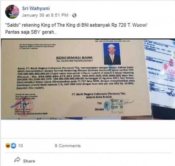 Dan akun Sri Wahyuni (fb.com/busri.wahyuni) dengan narasi “”Saldo” rekening King of The King di BNI sebanyak Rp 720 T. Wuow! Pantas saja SBY gerah..”