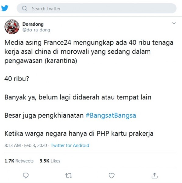 Beredar tweet yang berasal dari akun Doradong (twitter.com/do_ra_dong) sebagai berikut :“Media asing France24 mengungkap ada 40 ribu tenaga kerja asal china di morowali yang sedang dalam pengawasan (karantina)40 ribu?Banyak ya, belum lagi didaerah atau tempat lainBesar juga pengkhianatan #BangsatBangsa Ketika warga negara hanya di PHP kartu prakerja”