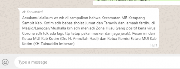Masyarakat Sampit, Kabupaten Kotawaringin Timur (Kotim) dihebohkan dengan munculnya informasi yang beredar melalui pesan berantai Whatsapp, terkait dengan ajakan shalat Jumat dan tarawih di masjid. Menurut narasi yang beredar, disebutkan bahwa saat ini warga Kecamatan MB Ketapang sudah dapat melaksanakan ibadah shalat Jumat dan tarawih di masjid.Hal tersebut berdasarkan dari status wilayah Kecamatan MB Ketapang yang sebelumnya zona merah kini sudah pulih menjadi zona hijau. Agar lebih meyakinkan para pembaca, pesan tersebut juga turut mencatut nama Ketua MUI Kotawaringin Timur dan Ketua Komisi Fatwa MUI setempat.Namun belakangan informasi tersebut diketahui tidak benar adanya. Melansir dari tabengan.com, Kepala Kementerian Agama (Kemenag) Kotim menyatakan bahwa narasi dalam pesan tersebut adalah palsu alias tidak sesuai dengan fakta. Samsudin menjelaskan bahwa hingga saat ini masih belum ada kebijakan seperti halnya narasi dalam pesan.“Kami belum memutuskan apapun terkait hal tersebut, rencananya baru hari ini kami akan rapat di aula Kemenag bersama Pemda, Polres, TNI, NU, Muhammadiyah, Dinkes dan pihak terkait lainnya,” pungkas Samsudin.Lebih lanjut Samsudin menjelaskan bahwa hingga saat ini pihaknya belum mencabut keputusan perihal imbauan agar warga tetap melaksanakan ibadah di rumah masing-masing. Pasalnya untuk status zona hijau hanya berada di Kecamatan MB Ketapang, sementara Kecamatan kota lain yakni Baamang statusnya masih merah.“Kita khawatir nanti warga Baamang justru ikut di MB Ketapang, artinya yang zona merah masuk ke zona hijau. Untuk itu akan kami bahas bersama masalah ini,” jelas Samsudin.Narasi terkait dengan sudah diperbolehkannya warga Kecamatan MB Ketapang melaksanakan ibadah di masjid masuk ke dalam kategori false context. False context sendiri merupakan sebuah konten yang disajikan dengan narasi dan konteks yang salah. Biasanya, false context memuat pernyataan, foto, atau video peristiwa yang pernah terjadi pada suatu tempat, namun secara konteks yang ditulis tidak sesuai dengan fakta yang ada.