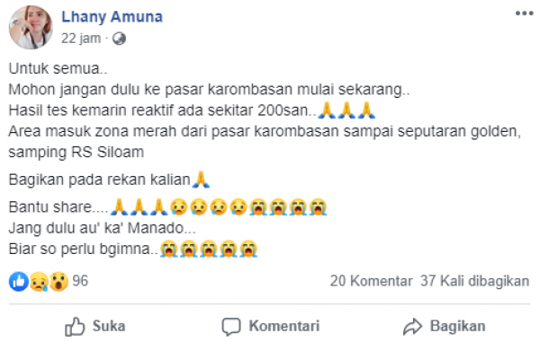 NARASI:Untuk semua..Mohon jangan dulu ke pasar karombasan mulai sekarang..Hasil tes kemarin reaktif ada sekitar 200san..????????????Area masuk zona merah dari pasar karombasan sampai seputaran golden, samping RS SiloamBagikan pada rekan kalian????Bantu share….????????????????????????????????????????????Jang dulu au’ ka’ Manado…Biar so perlu bgimna..????????????????????