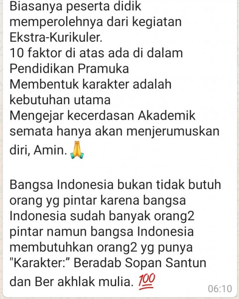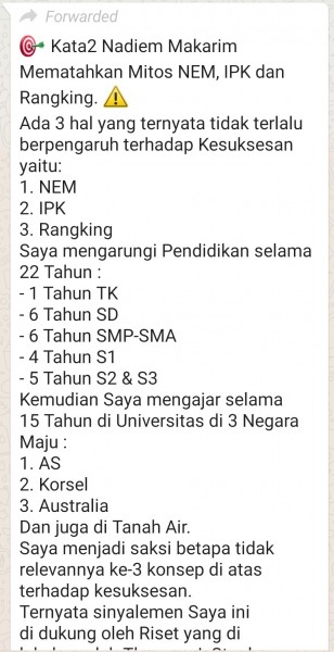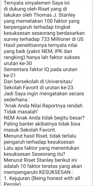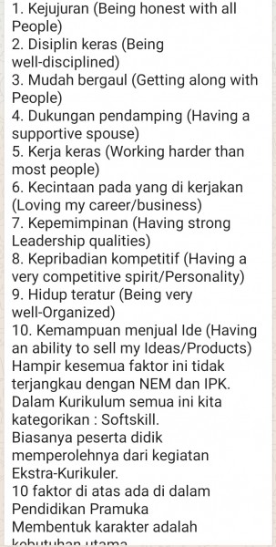 Kata2 Nadiem Makarim Mematahkan Mitos NEM, IPK dan Rangking. ??Ada 3 hal yang ternyata tidak terlalu berpengaruh terhadap Kesuksesan yaitu:1. NEM2. IPK 3. RangkingSaya mengarungi Pendidikan selama 22 Tahun :- 1 Tahun TK- 6 Tahun SD- 6 Tahun SMP-SMA- 4 Tahun S1- 5 Tahun S2 & S3Kemudian Saya mengajar selama 15 Tahun di Universitas di 3 Negara Maju :1. AS2. Korsel3. Australia Dan juga di Tanah Air. Saya menjadi saksi betapa tidak relevannya ke-3 konsep di atas terhadap kesuksesan. Ternyata sinyalemen Saya ini di dukung oleh Riset yang di lakukan oleh Thomas J. Stanley yang memetakan 100 faktor yang berpengaruh terhadap tingkat kesuksesan seseorang berdasarkan survey terhadap 733 Millioner di USHasil penelitiannya ternyata nilai yang baik (yakni NEM, IPK dan rangking) hanya lah faktor sukses urutan ke-30 Sementara faktor IQ pada urutan ke-21 Dan bersekolah di Universitas/Sekolah Favorit di urutan ke-23. Jadi Saya ingin mengatakan secara sederhana : "Anak Anda Nilai Raportnya rendah Tidak masalah"NEM Anak Anda tidak begitu besar? Paling banter akibatnya tidak bisa masuk Sekolah Favorit. Menurut hasil Riset, tidak terlalu pengaruh terhadap kesuksesanLalu apa faktor yang menentukan kesuksesan Seseorang itu?Menurut Riset Stanley berikut ini adalah 10 faktor teratas yang akan mempengaruhi KESUKSESAN :1. Kejujuran (Being honest with all People)2. Disiplin keras (Being well-disciplined)3. Mudah bergaul (Getting along with People)4. Dukungan pendamping (Having a supportive spouse)5. Kerja keras (Working harder than most people)6. Kecintaan pada yang di kerjakan (Loving my career/business)7. Kepemimpinan (Having strong Leadership qualities)8. Kepribadian kompetitif (Having a very competitive spirit/Personality)9. Hidup teratur (Being very well-Organized)10. Kemampuan menjual Ide (Having an ability to sell my Ideas/Products)Hampir kesemua faktor ini tidak terjangkau dengan NEM dan IPK. Dalam Kurikulum semua ini kita kategorikan : Softskill.Biasanya peserta didik memperolehnya dari kegiatan Ekstra-Kurikuler.10 faktor di atas ada di dalam Pendidikan PramukaMembentuk karakter adalah kebutuhan utamaMengejar kecerdasan Akademik semata hanya akan menjerumuskan diri, Amin.????Bangsa Indonesia bukan tidak butuh orang yg pintar karena bangsa Indonesia sudah banyak orang2 pintar namun bangsa Indonesia membutuhkan orang2 yg punya "Karakter:” Beradab Sopan Santun dan Ber akhlak mulia. ????