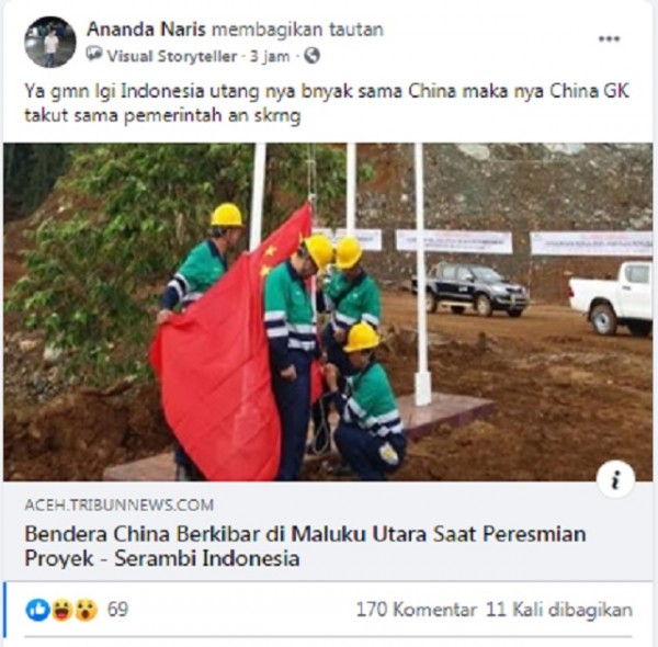 Beredar sebuah artikel berjudul “Bendera China Berkibar di Maluku Utara Saat Peresmian Proyek” di media sosial platform Facebook dengan narasi pengibaran bendera itu karena Tiongkok tidak takut dengan Pemerintahan sekarang atau rezim Joko Widodo-Ma’ruf Amin pada 23 Mei 2020.