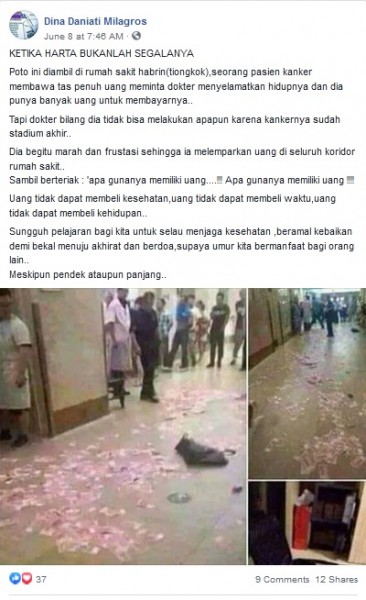 Akun Dina Daniati Milagros (fb.com/dina.daniati.7583) mengunggah gambar dengan narasi sebagai berikut:“KETIKA HARTA BUKANLAH SEGALANYAPoto ini diambil di rumah sakit habrin(tiongkok),seorang pasien kanker membawa tas penuh uang meminta dokter menyelamatkan hidupnya dan dia punya banyak uang untuk membayarnya..Tapi dokter bilang dia tidak bisa melakukan apapun karena kankernya sudah stadium akhir..Dia begitu marah dan frustasi sehingga ia melemparkan uang di seluruh koridor rumah sakit. Sambil berteriak : ‘apa gunanya memiliki uang….!!! Apa gunanya memiliki uang !!!!Uang tidak dapat membeli kesehatan,uang tidak dapat membeli waktu,uang tidak dapat membeli kehidupan. Sungguh pelajaran bagi kita untuk selau menjaga kesehatan ,beramal kebaikan demi bekal menuju akhirat dan berdoa,supaya umur kita bermanfaat bagi orang lain..Meskipun pendek ataupun panjang..”