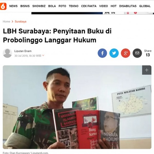 Dari hasil penelusuran, klaim pada foto tangkapan layar bahwa Megawati memberikan kata pengantar pada buku PKI adalah salah. Judul pada artikel yang beredar adalah hasil editan. Dari hasil pencarian, ditemukan foto serupa dalam artikel yang diunggah Liputan6.com dengan judul "LBH Surabaya: Penyitaan Buku di Probolinggu Langgar Hukum" pada tanggal 30 Juli 2019.Dalam artikel tersebut dijelaskan, LBH Surabaya mengecam aksi penyitaan oleh pihak Polsek Kraksaan dan TNI Kabupaten Probolinggo terhadap buku-buku yang diduga memuat ajaran komunis milik komunitas Vespa Literasi pada 27 Juli 2019. Pegiat komunitas tersebur, Muntasir Billah, 24 dan Saiful Anwar, 25 juga turut diamankan polisi. Terdapat empat buku yang disita yaitu, Aidit Dua Wajah Dipa, Sukarno, Marxisme, dan Leninisme: Akar Pemikiran Kiri dan Revolusi Indonesia, Menempuh Jalan Rakyat, dan D.N. Aidit "Sebuah Biografi Ringkas".Direktur LBH Surabaya, Abdul Wahid mengatakan, penyitaan buku-buku tersebut melanggar putusan Mahkamah Konstitusi Nomor 20/PUU-VIII/2010. Putusan itu menyebutkan penyitaan tanpa proses peradilan merupakan proses eksekusi ekstra yudisial yang bertentangan dengan konsep negara hukum. Penyitaan harus melalui proses peradilan terlebih dahulu. "Selain itu, pelibatan TNI dalam penyitaan buku ini termasuk tindakan melampaui wewenang, abuse of power sebab berdasarkan UU Nomor 34 Tahun 2004 tentang TNI, militer bukanlah bagian dari penegak hukum,"dilansir Liputan6.com. Berita serupa dilansir dari Kompas.com, Kepala Divisi Riset, Pengembangan dan Kerjasama Lembaga Bantuan Hukum (LBH) Surabaya Sahura mengkritik penyitaan sejumlah buku DN Aidit milik komunitas Vespa Literasi di Probolinggo, Jawa TimurSahura menilai, tindakan yang dilakukan polisi merupakan tindakan sewenang-wenang dan perbuatan melanggar hukum. Menurut Sahura, penyitaan buku tersebut tidak sesuai dengan putusan Mahkamah Konstitusi (MK). Pelibatan TNI dalam penyitaan buku ini, menurut Sahura, termasuk abuse of power atau tindakan yang melampaui wewenang. Sebab, berdasarkan UU Nomor 34 Tahun 2004 tentang TNI, kata Sahura, militer bukanlah bagian dari penegak hukum.