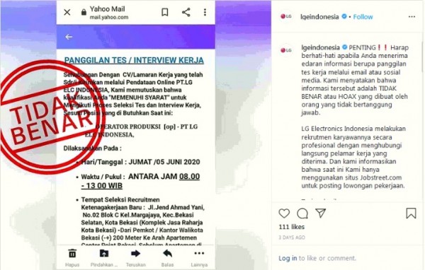 Ekonomi - (Lowongan) Pekerjaan Institusi - Perusahaan Informasi Seleksi Tes dan Interview Kerja LG Electronics Indonesia Beredar informasi di media sosial mengenai surat panggilan proses seleksi tes dan interview kerja mengatasnamakan LG Electronics Indonesia. Dalam surat itu disebutkan, proses seleksi untuk posisi Operator Produksi tersebut dilaksanakan pada hari Jumat, 5 Juni 2020 bertempat di jalan Jendral Ahmad Yani Bekasi. Sumber: MEDIA SOSIAL