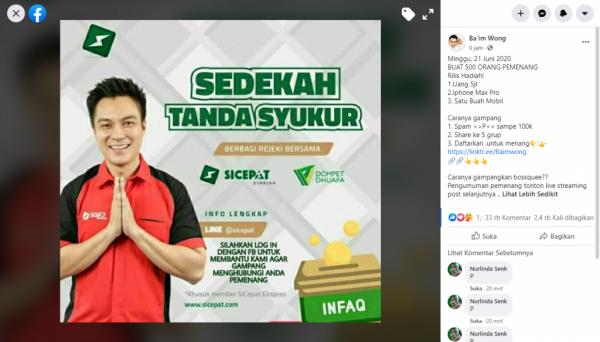 Narasi:“Minggu, 21 Juni 2020BUAT 500 ORANG PEMENANGRilis Hadiah!1.Uang 5jt2.Iphone Max Pro3. Satu Buah MobilCaranya gampang1. Spam >>P<< sampe 100k2. Share ke 5 grup3. Daftarkan .untuk menang????:????https://linktr[dot]ee/Baimwong????????????????????Caranya gampangkan bossquee??Pengumuman pemenang tonton live streaming post selanjutnya ..”