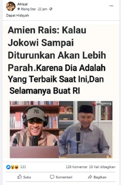 Beredar narasi bahwa mantan Ketua MPR Amien Rais menyebut Presiden Joko Widodo (Jokowi) merupakan sosok terbaik saat ini dan selamanya buat Republik Indonesia (RI). Narasi ini beredar di media sosial. Adalah akun facebook Afrizal yang mengunggah sebuah tangkapan layar berisi narasi tersebut. Berikut narasi lengkapnya: "Amien Rais: KalauJokowi Sampai Diturunkan Akan LebihParah.Karena Dia AdalahYang Terbaik Saat Ini,DanSelamanya Buat RI."