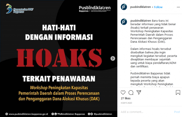 Beredar sebuah informasi yang disebarkan dalam bentuk surat mengatasnamakan Pusbindiklatren Bappenas terkait penawaran Workshop Peningkatan Kapasitas Pemerintah Daerah dalam Proses Perencaraan dan Penganggaran Dana Alokasi Khusus (DAK). Disebutkan bahwapara peserta yang ingin mengikuti kegiatan tersebut, diharuskan membayar sejumlah uang sebagai biaya pendaftaran/ADM dan sertifikasi.Menanggapi adanya informasi yang tidak sesuai dengan fakta dan dianggap memiliki indikasi penipuan, Bappenas pun akhirnya angkat bicara. Melalui laman resminya pusbindiklatren.bappenas.go.id dinyatakan bahwa surat tersebut bukan produk Bappenas dan masuk ke dalam daftar penipuan yang mengatasnamakan Pusbindiklatren Bappenas.Berikut klarifikasi lengkap yang diberikan oleh Pusbindiklatren Bappenas:“Pusbindiklatren Bappenas tidak pernah meminta biaya apapun kepada peserta yang akan mengikuti Workshop Peningkatan Kapasitas Pemerintah Daerah dalam Proses Perencanaan dan Penganggaran Dana Alokasi Khusus(DAK)..Pusbindiklatren Bappenas juga tidak pernah meminta biaya apapun kepada peserta yang akan mengikuti kegiatan-kegiatan lain yang diselenggarakan oleh Pusbindiklatren Bappenas..Jika terdapat informasi kegiatan lain yang mengatasnamakan Pusbindiklatren Bappenas dan meminta biaya dari peserta, mohon konfirmasikan kebenarannya melalui.Telepon : (021) 319-28280/319-28285/319-28279.Pos-el (e-mail) : pusbindiklatren@bappenas.go.id.atau dengan mengirimkan pesan melalui media sosial Pusbindiklatren Bappenas (Facebook, Instagram, Twitter).”