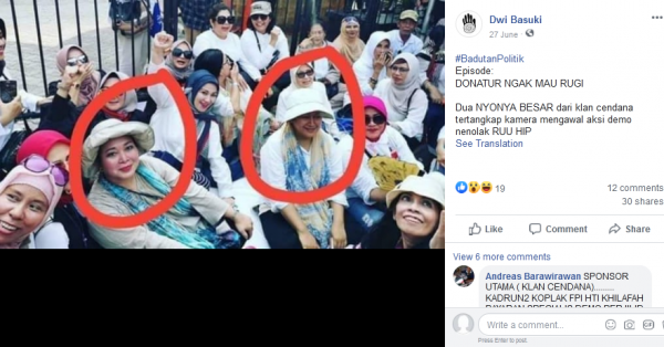 Akun Dwi Basuki (fb.com/dwi.basuki.3388) mengunggah sebuah foto dengan narasi sebagai berikut:“#BadutanPolitikEpisode: DONATUR NGAK MAU RUGIDua NYONYA BESAR dari klan cendana tertangkap kamera mengawal aksi demo nenolak RUU HIP”Foto itu memperlihatkan Siti Hediati Hariyadi atau alias Titiek Soeharto sedang bersama sejumlah orang.