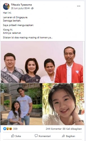 Beredar narasi bahwa putra Presiden Joko Widodo (Jokowi), Kaesang Pangarep menggelar lamaran di Singapura, Minggu 28 Juni 2020. Narasi ini beredar di media sosial. Adalah akun facebook Tifauzia Tyassuma mengunggah narasi tersebut. Berikut narasi lengkapnya: "Hari ini,Lamaran di Singapura.Semoga berkah.Saya pribadi mengucapkan:Kiong hi.Artinya: selamat.Silakan isi doa masing-masing di komen ya...," tulis akun Tifauzia Tyassuma, Minggu 28 Juni 2020.