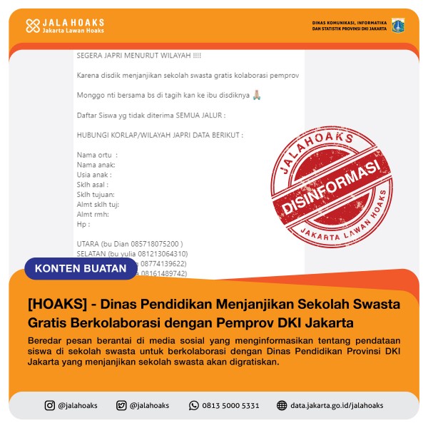 Beredar pesan berantai di media sosial yang menginformasikan tentang pendataan siswa di sekolah swasta untuk berkolaborasi dengan Dinas Pendidikan Provinsi DKI Jakarta yang menjanjikan sekolah swasta akan digratiskan.
