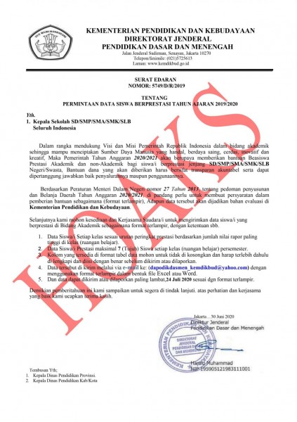 Surat edaran permintaan data siswa berprestasi tahun ajaran 2019/2020 yang mengatasnamakan Kementerian Pendidikan dan Kebudayaan (Kemendikbud) beredar di masyarakat.