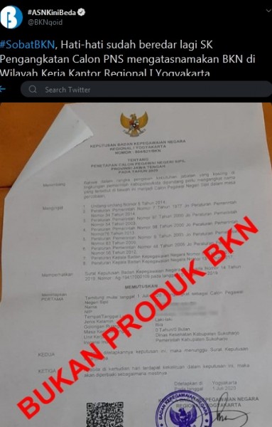 Ekonomi - (Lowongan) Pekerjaan DI Yogyakarta Surat Keputusan Pengangkatan CPNS Mengatasnamakan BKN Yogyakarta Telah beredar sebuah surat keputusan pengangkatan CPNS yang mengatasnamakan BKN Wilayah kerja Regional I Yogyakarta. Berdasarkan isi surat orang yang diangkat tersebut akan ditempatkan di Dinas Kesehatan Kabupaten Sukoharjo. Sumber: TWITTER