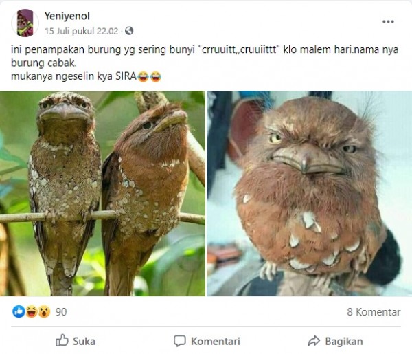 Foto yang diklaim sebagai penampakan burung cabak beredar di media sosial. Foto tersebut disebarkan akun Facebook He?iin pada 16 Juli 2020.Akun Facebook He?iin mengunggah dua foto yang diklaim sebagai burung cabak. Burung tersebut tampak berwarna coklat dengan paruh yang unik. Akun Facebook He?iin menambahkan sebuah narasi dalam konten yang diunggahnya."ini penampakan burung yg sering bunyi "crruuitt,,cruuiittt" klo malem hari.nama nya burung cabak.mukanya ngeselin kya SIRA????????," tulis akun Facebook He?iin.Konten yang disebarkan akun Facebook He?iin telah 327 kali dibagikan dan mendapat 3 komentar warganet.
