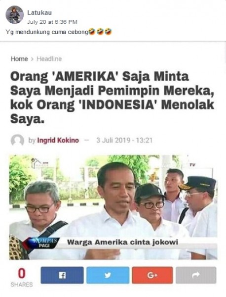 Beredar sebuah tangkapan layar artikel berita yang menerasikan Presiden Joko Widodo mengaku diminta menjadi pemimpin warga Amerika. Tangkapan layar artikel berita ini beredar di media sosial facebook."Yg mendunkung cuma cebong????????????"Artikel berita tersebut berjudul "Orang AMERIKA Saja Minta Saya Menjadi Pemimpin Mereka, kok Orang INDONESIA Menolak Saya". Terdapat logo Kompas TV dalam artikel tersebut dengan keterangan "Warga Amerika cinta jokowi".