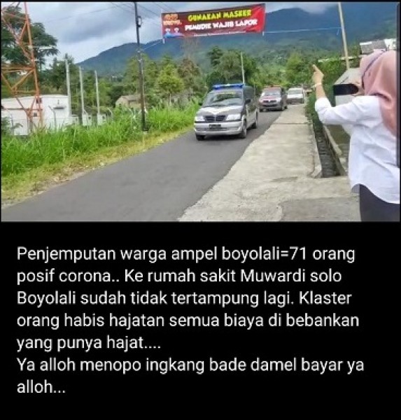 Beredar informasi 71 warga Ampel, Boyolali, yang dinyatakan positif Covid-19 dijemput untuk dibawa ke RSUD Moewardi Solo. Kabarnya seluruh warga tersebut terinfeksi virus corona melalui klaster hajatan.Informasi yang beredar via Whatsapp tersebut berasal dari sebuah gambar dengan narasi penjemputan warga.Penjemputan warga ampel boyolali=71 orang posif corona.. Ke rumah sakit Muwardi solo. Boyolali sudah tidak tertampung lagi. Klaster orang habis hajatan semua biaya di bebankan yang punya hajat.... Ya alloh menopo ingkang bade damel bayar ya alloh [Ya Allah apa yang mau dipakai untuk membayar]...," demikian tertulis di gambar yang beredar viral tersebut.