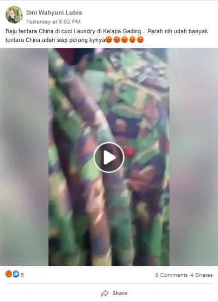 Jagad media sosial dihebohkan dengan adanya video yang menyebutkan seragam tentara China yang dicuci di tempat laundry Kelapa Gading, Jakarta Utara. Dalam video itu, tampak deretan seragam tentara tengah dicuci.Pembuatan video itu juga berbicara dengan kalimat provokasi dengan menyebut tentara komunis China siap perang di Tanah Air."Tentara China nih, nggak tahu maksudnya apa tentara China nyuci baju di Kelapa Gading. Pasukannya sudah banyak, siap perang kayaknya. Satu batalion kayaknya nih," demikian pernyataan pria pembuat video tersebut dikutip Okezone dari akun Instagram Polres Metro Jakarta Utara, Minggu (26/7/2020).