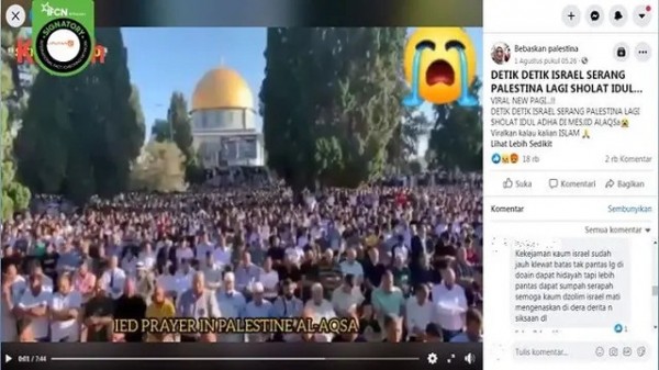 Sebuah video yang diklaim sebagai aksi penyerangan Israel terhadap warga Palestina yang tengah menjalankan salat Iduladha pada 31 Juli 2020 beredar di media sosial. Video ini disebarkan akun Facebook Bebaskan palestina.Dalam video berdurasi 7 menit 44 detik itu, tampak ratusan orang tengah menjalankan salat Ied di halaman Masjid Al Aqsa, Palestina. Pada adegan lain, tampak sejumlah warga bentrok dengan aparat setempat. Beberapa aparat juga terlihat mengamankan warga.Akun Facebook Bebaskan palestina mengaitkan video tersebut Israel yang menyerang warga Palestina usai salat Iduladha di Masjid Al Aqsa pada 31 Juli 2020."VIRAL NEW PAGI...!!DETIK DETIK ISRAEL SERANG PALESTINA LAGI SHOLAT IDUL ADHA DI MESJID Al,AQSa????Viralkan kalau kalian ISLAM ????," tulis akun Facebook Bebaskan palestina.