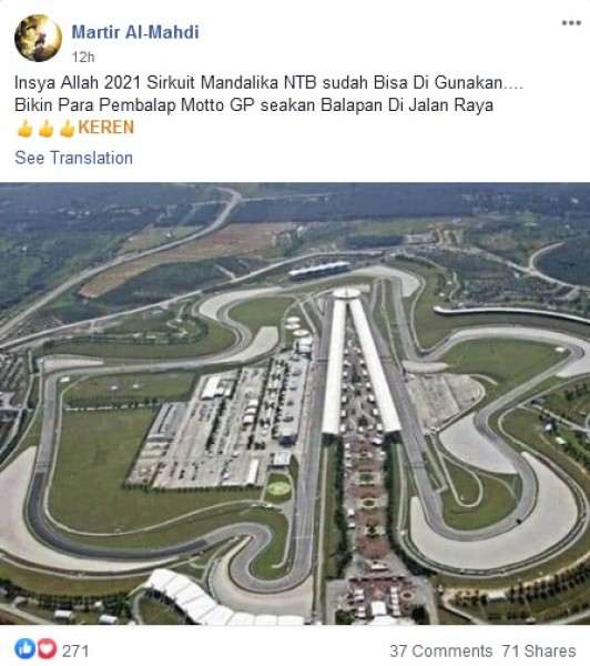 Beredar sebuah foto dari akun Facebook yang mengambarkan sirkuit yang disebut sirkuit Mandalika, NTB dengan narasi klaim bahwa sirkuit Mandalika di NTB siap digunakan pada tahun 2021. Narasi yang diunggah “Insya Allah 2021 Sirkuit Mandalika NTB sudah Bisa Di Gunakan….Bikin Para Pembalap Motto GP seakan Balapan Di Jalan Raya”