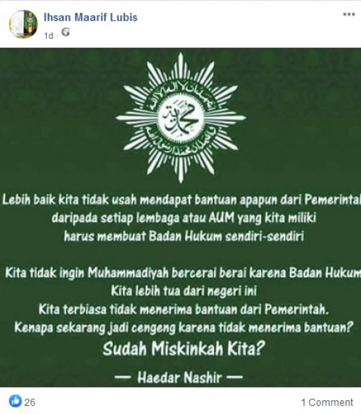 Beredar sebuah kutipan pesan yang mengatasnamakan Haedar Nashir. Belakangan tulisan tersebut ramai diperbincangkan warga Muhammadiyah baik melalui pesan elektronik maupun media sosial.Selain mencatut Haedar Nashir, pesan dalam gambar tersebut juga memuat lambang Muhammadiyah. Adapun isi tulisannya yaitu:Lebih baik kita tidak usah mendapat bantuan apapun dari Pemerintah daripada setiap lembaga atau AUM yang kita miliki harus membuat Badan Hukum sendiri-sendiri.Kita tidak ingin Muhammadiyah bercerai berai karena Badan Hukum Kita lebih tua dari negeri iniKita terbiasa tidak menerima bantuan dari Pemerintah. Kenapa sekarang jadi cengeng karena tidak menerima bantuan? Sudah Miskinkah Kita?
