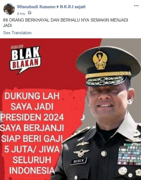 Beredar foto yang memperlihatkan mantan Panglima TNI Jenderal TNI Purn Gatot Nurmantyo di media sosial. Foto itu dinarasikan bahwa Gatot seolah mengatakan bahwa dirinya akan memberikan gaji sebesar Rp5 juta kepada seluruh rakyat Indonesia jika terpilih menjadi presiden. Akun Facebook Wisnubudi Kusumo membagikan foto itu pada Kamis, 27 Agustus 2020. Pada foto yang beredar terdapat narasi bertuliskan sebagai berikut: "DUKUNG LAH SAYA JADI PRESIDEN 2024 SAYA BERJANJI SIAP BERI GAJI 5 JUTA/ JIWA SELURUH INDONESIA".