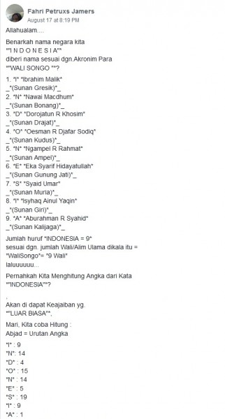 Tulisan panjang yang berisi klaim bahwa nama Indonesia berasal dari akronim inisial para Wali Songo kembali ramai dibagikan di media sosial. Klaim itu diunggah salah satunya oleh akun Facebook Postmaster Gusbud pada 18 Agustus 2019. Berikut sebagian isi tulisan panjang yang berisi klaim tersebut:Benarkah nama negara kita"I N D O N E S I A"diberi nama sesuai dgn.Akronim Para"WALI SONGO "?1. I Ibrahim Malik(Sunan Gresik)2. N Nawai Macdhum(Sunan Bonang)3. D Dorojatun R Khosim(Sunan Drajat)4. O Oesman R Djafar Sodiq(Sunan Kudus)5. N Ngampel R Rahmat(Sunan Ampel)6. E Eka Syarif Hidayatullah(Sunan Gunung Jati)7. S Syaid Umar(Sunan Muria)8. I Isyhaq Ainul Yaqin(Sunan Giri)9. A Aburahman R Syahid(Sunan Kalijaga)Jumlah huruf INDONESIA = 9sesuai dgn. jumlah Wali/Alim Ulama dikala itu =WaliSongo= 9 Wali