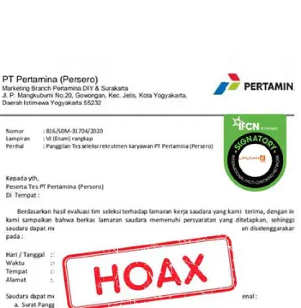 Ekonomi - (Lowongan) Pekerjaan DI Yogyakarta Surat Panggilan Calon Karyawan PT Pertamina DIY dan Surakarta Beredar sebuah surat panggilan seleksi calon karyawan PT Pertamina untuk Daerah Istimewa Yogyakarta dan Surakarta. Dalam surat tersebut dinyatakan PT Pertamina akan melakukan tes seleksi calon karyawan pada Sabtu dan Minggu, 29 - 30 Agustus 2020 mendatang. Tes diadakan di Kantor Pertamina Marketing Branch DIY dan Surakarta di Yogyakarta. Sumber: BERITA DARING