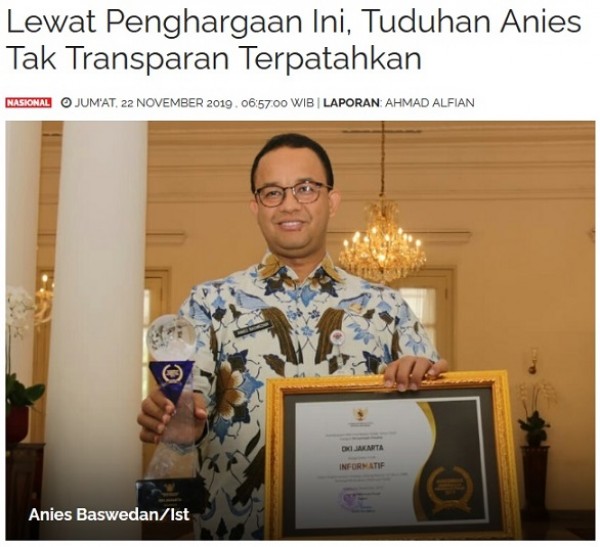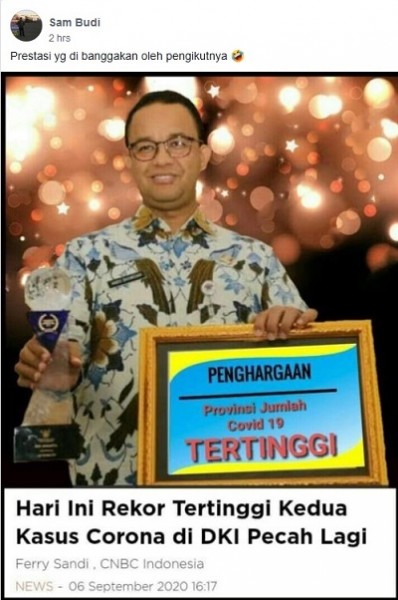 Akun Facebook Sam Budi mengunggah foto Gubernur DKI Jakarta, Anies Baswedan yang nampak mengenakan batik dengan memegang trofi dan piagam penghargaan. Pada piagam penghargaan, terdapat tulisan “PENGHARGAAN Provinsi Jumlah Covid 19 Tertinggi.” NARASI:“Prestasi yg di banggakan oleh pengikutnya ????,” tulis akun Facebook Sam Budi dengan menyematkan foto Gubernur DKI Jakarta, Anies Baswedan yang memegang trofi dan piagam penghargaan, pada Selasa (8/9).