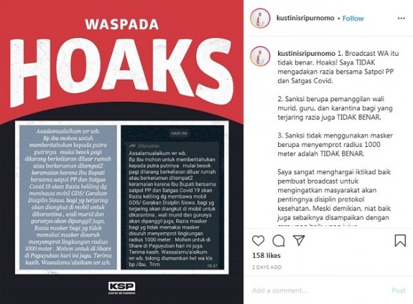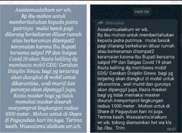 Beredar pesan berantai melalui WhatsApp Ibu Bupati Sleman Kustini Sri Purnomo adakan razia masker. Dalam postingannya terdapat narasi “Assalamu'alaikum Bapak / Ibu mohon untuk memberitahukan kepada putra putrinya. Mulai malam ini #Dilarang berkeliaran diluar rumah atau berkerumun ditempat2 #Keramaian karena Ibu Bupati bersama satpol PP dan Satgas Covid 19 akan Razia keliling dg membawa mobil GDS Gerakan Disiplin Siswa bagi yg terjaring akan diangkut di mobil untuk dikarantina , wali murid dan gurunya akan dipanggil juga, Razia masker bagi yg tidak memakai masker disuruh menyemprot lingkungan radius 1000 meter .Terima kasih. Wassalamu'alaikum ".