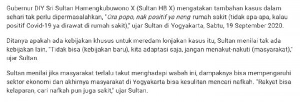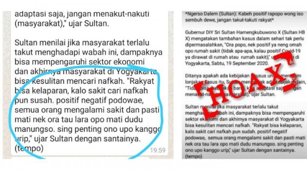 Beredar pesan berantai Whatsapp dengan klaim dari tempo yang berisi narasi Sultan Hamengkubuwana X menyebut ‘positif dan negatif Covid-19 sama saja karena semua orang pasti meninggal’. NARASI:“*Ngerso Dalem (Sultan): Kabeh positif rapopo wong iso sembuh dewe, jangan takut-takuti rakyat*Gubernur DIY Sri Sultan Hamengkubuwono X (Sultan HB X) mengatakan tambahan kasus dalam sehari tak perlu dipermasalahkan, “Ora popo, nek positif ya neng omah opo rumah sakit (tidak apa-apa, kalau positif Covid-19 ya dirawat di rumah atau rumah sakit),” ujar Sultan di Yogyakarta, Sabtu, 19 September 2020.Ditanya apakah ada kebijakan khusus untuk meredam lonjakan kasus itu, Sultan menilai tak ada kebijakan lain, “Tidak bisa (kebijakan baru), kita adaptasi saja, jangan menakut-nakuti (masyarakat),” ujar Sultan.Sultan menilai jika masyarakat terlalu takut menghadapi wabah ini, dampaknya bisa mempengaruhi sektor ekonomi dan akhirnya masyarakat di Yogyakarta bisa kesulitan mencari nafkah. “Rakyat bisa kelaparan, kalo sakit cari nafkah pun sudah. positif negatif podowae, semua orang mengalami sakit dan pasti mati nek ora tau lara opo mati dudu manungso. sing penting ono upo kanggo urip,” ujar Sultan dengan santainya.