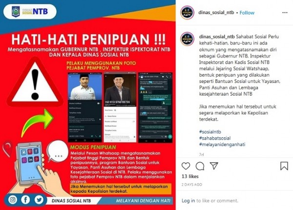 Beredar sebuah pesan WhatsApp mengatasnamakan Gubernur Nusa Tenggara Barat (NTB), Inspektur Inspektorat dan Kadis Sosial NTB. Pesan tersebut berisi informasi terkait bantuan sosial untuk Yayasan, Panti Asuhan dan Lembaga Kesejahteraan Sosial di NTB.