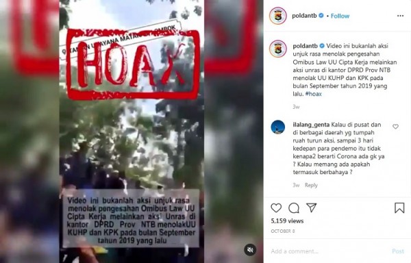 Dari hasil penelusuran diketahui informasi tersebut salah. Faktanya kejadian tersebut terjadi pada bulan September 2019 pada saat aksi penolakan RUU KUHP dan KPK. Diketahui terdapat video serupa diunggah oleh laman Facebook bernama ‘World Reality’ pada tanggal 10/10/2019 dengan judul “Demo Mahasiswa Mataram Lombok Nusa Tenggara Barat (NTB) Menolak RUU Kontroversial Di Kantor DPRD Berujung Ricuh dan Bentrok Dengan Aparat”. Dalam video tersebut terlihat cuplikan video dimenit ke 0:42 yang sama dengan video pada status.Polda NTB melalui akun instagramnya (@poldantb) telah memberikan klarifikasi pada cuplikan video yang beredar di media sosial tersebut. Dijelaskan bahwa video tersebut bukan aksi unjuk rasa Omnibus Law melainkan aksi unjuk rasa di kantor DPRD Prov. NTB yang menolak UU KUHP dan KPK bulan September 2019.Dilansir dari liputan6.com, Kericuhan demo mahasiswa tersebut bermula saat mahasiswa mencoba menerobos gerbang gedung DPRD dan dihalau oleh aparat kepolisian yang berjaga dengan melepaskan gas air mata. Spontan, para mahasiswa yang ingin menyampaikan aspirasinya tersebut berhamburan untuk menghindari gas dengan memasuki ruangan gedung yang ada di seberang gedung DPRD. Beberapa mahasiswa dan mahasiswi dilarikan ke rumah sakit karena terluka pada saat kericuhan.