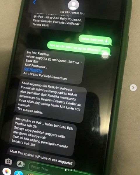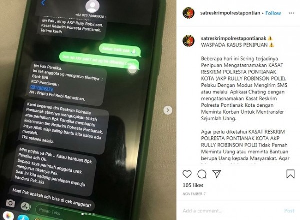 Beredar pesan dengan nomor “+6282375985920” mengaku Kasat Reskrim Polresta Pontianak Kota, AKP Rully Robinson Polii, meminta sejumlah dana. NARASI]:+6282375985920 : Selamat mlm Pak Dedy..Apa kbr Pak..Mdh2an sehat dan baik aja.Ijin Pak, ini sy AKP Rully Robinson.Kasat Reskrim Polresta Pontianak.Terima kasihKorban : kabar baik pak ????bpk ap kbr pak? ad yg bs dibantu pak?+6282375985920 : Ijin Pak Pandika.Ini rek anggota yg mengurus tiketnya :Bank BNIKCP Pontianak :0917589379An : Briptu Pol Robi Ramadhan.+6282375985920 : Kami ssegenap tim Reskrim Polresta Pontianak sblmnya mengucapkan tmksh atas perhatian Bpk Pandika membantu kelancaran tim Reskrim Polresta Pontianak. Insya Allah siap saling bantu kita kalau ada masalah.Tks sukses selalu.+6282375985920 : Mhn ptnjuk ya Pak .. Kalau bantuan Bpk Pandika sdh Ok.Supaya saya perintah anggota untk mengurus tiketnya Pak.Saat ini kita sedang persiapan menuju bandara Pak ..tks+6282375985920 : Maaf Pak apakah sdh bisa di cek anggota?