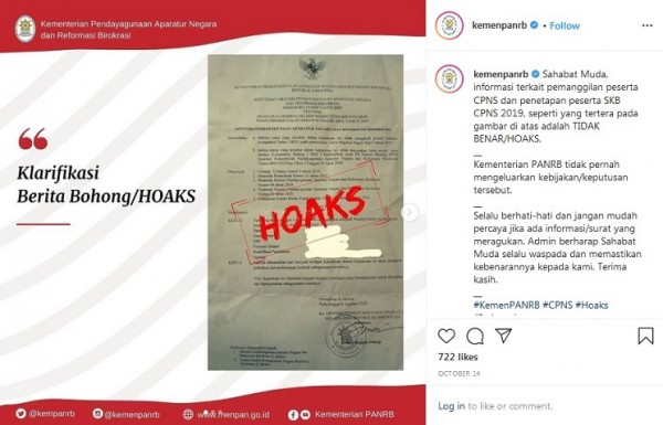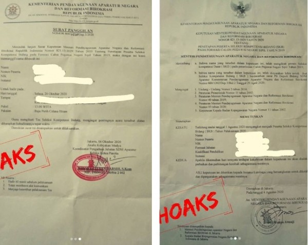 Beredar sebuah kertas surat berisi informasi pemanggilan peserta Calon Pegawai Negeri Sipil dan penetapan peserta SKB CPNS 2019 oleh Kementerian Pendayagunaan Aparatur Negara dan Reformasi Birokrasi (PANRB). Menurut narasi yang tertera, bagi peserta penerima surat diharapkan mengikuti tes SKB yang akan dilakukan pada 20 Oktober 2020. NARASI:KEMENTERIAN PENDAYAGUNAAN APARATUR NEGARA DAN REFORMAI BIROKRASI REPUBLIK INDONESIAKEPUTUSAN MENTERI PENDAYAGUNAAN APARATUR NEGARA DAN REFORMMASI BIROKRASSINOMOR 821-13-1029 TAHUN 2020TENTANGPENETAPAN PESERTA SELEKSI KOMPETENSI BIDANG (SK) PADA FORMASI CALON PEGAWAI NEGERI SIPIL TAHUN 2019