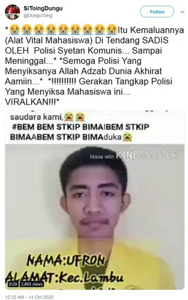 Akun Twitter SiToingDungu (@DunguToing) mengunggah cuitan berupa narasi dengan disertai video hasil perekaman layar unggahan Facebook yang menginformasikan meninggalnya mahasiswa STKIP BIMA bernama Ufron saat aksi unjuk rasa tolak UU Cipta Kerja. Narasi:“????????????????????????????????????Itu Kemaluannya (Alat Vital Mahasiswa) Di Tendang SADIS OLEH Polisi Syetan Komunis… Sampai Meninggal… Semoga Polisi Yang Menyiksanya Allah Adzab Dunia Akhirat Aamiin… !!!!!!!!!! Gerakan Tangkap Polisi Yang Menyiksa Mahasiswa ini… VIRALKAN!!!”
