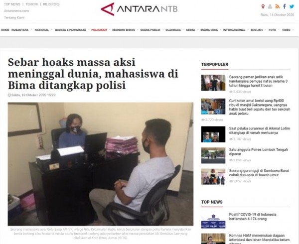 Seorang mahasiswa asal Kota Bima AR (27) warga Rite, Kecamatan Raba, harus berurusan dengan polisi karena menyebarkan berita bohong atau hoaks di media sosial facebook tentang adanya korban aksi massa penolakan UU Omnibus Law yang dilakukan di Kota Bima, Jumat (9/10).Ia memposting video durasi pendek yang menyatakan salah satu masa aksi GERAM Bima yang menggelar aksi tolak Undang-Undang Omnibus Law telah meninggal dunia."AR mengunggah video sekitar pukul 10.00 Wita, Jumat (9/10) usai menggelar aksi unjuk rasa di Kota Bima," kata Kapolres Bima Kota AKBP Haryo Tejo Wicaksono SIK, Sabtu. Dalam postingan itu, menyebutkan salah satu masa aksi yang diamankan oleh pihak kepolisian pasca aksi unjuk rasa terkait penolakan pengesahan UU Omnibus Law yang berlangusung pada hari Kamis tanggal 8 Oktober telah meninggal dunia.AR menyebarkan video berisi mahasiswa STISIP BIMA bernama Gufran (21) asal Desa Hidirasa, Kecamatan Lambu, Kabupaten Bima meninggal dunia. Video itu kemudian viral di media sosial dan banyak dibagikan.Tim Puma Satuan Reskrim Polres Bima Kota melakukan penangkapan terhadap AR sekitar Pukul 17.15 Wita. Dalam penangkapan itu diamankan barang bukti satu unit handphone dan satu sim card.“Sudah kami amankan di polres guna dimintai keterangan lebih lanjut” tandas Kapolres.Kapolres Bima mengimbau warga agar berhati-hati menggunakan dan memposting sesuatu di media sosial yang mengandung hoax dan unsur Suku, Agama dan Ras yang dapat memprovokasi masyarakat. Karena kepada pelaku penyebaran kebencian dan hoax melalui medsos akan berlaku UU ITE dengan ancaman pidana penjara.