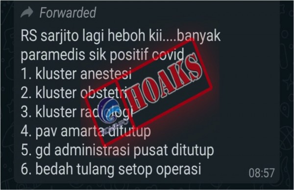 Untuk kesekian kalinya, muncul pesan berantai yang isinya menggambarkan kondisi tidak sepenuhnya benar, mengenai RSUP Dr Sardjito. Kali ini, pesan yang muncul menyatakan bahwa, ada banyak klaster penularan COVID-19 di RS tersebut.Dalam pesan berantai yang dikirimkan lewat WhatsApp, muncul informasi berbunyi seperti berikut:RS sarjito lagi heboh kii....banyak paramedis sik positif covid1. kluster anestesi2. kluster obstetri3. kluster radiologi4. pav amarta ditutup5. gd administrasi pusat ditutup6. bedah tulang setop operasi
