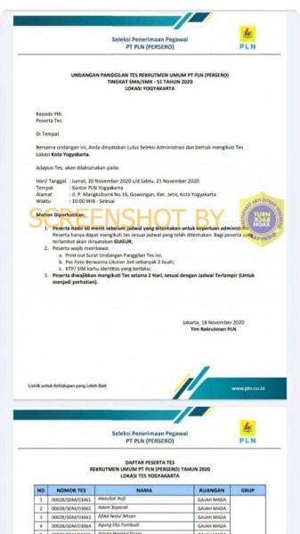 Beredar sebuah tangkapan layar berupa surat yang mengatasnamakan PLN. Isi pada tangkapan layar tersebut perihal undangan panggilan tes rekrutmen umum PT PLN (PERSERO) tingkat SMA/SMK – S1 lokasi Yogyakarta. Pada surat tersebut terdapat informasi tes akan dilaksanakan pada Jumat, 20 November 2020 s/d 21 November 2020 di Kantor PLN Yogyakarta pada jam 10.00 WIB. NARASI:“UNDANGAN PANGGILAN TES REKRUTMEN UMUM PT PLN (PERSERO)TINGKAT SMA/SMK – S1 TAHUN 2020LOKASI YOGYAKARTAKepada Yth.Peserta TesDi TempatBersama undangan ini, Anda dinyatakan Lulus Seleksi Administrasi dan berhak mengikuti Tes Lokasi Kota Yogyakarta.Adapun Tes, akan dilaksanakan pada:Hari/Tanggal : Jumat, 20 November 2020 s/d Sabtu, 21 November 2020Tempat: Kantor PLN YogyakartaAlamat: Kantor PLN YogyakartaWaktu: 10.00 WIB – Selesai”