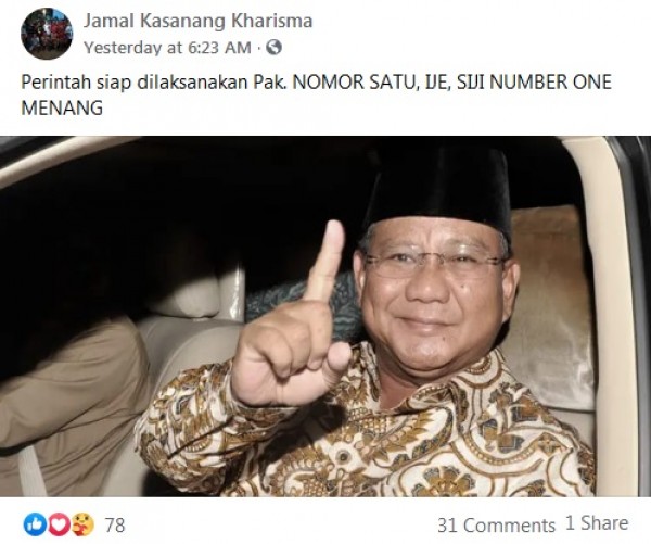 Akun Facebok bernama Jamal Kasanang Kharisma membagikan sebuah postingan berupa gambar dalam grup Pilkada Kalteng 2020. Postingan yang mendapat likes sebanyak 78 dan 31 komentar memperlihatkan foto Prabowo mengacungkan 1 jari telunjuk yang kemudian diklaim oleh akun Jamal bahwa Prabowo mendukung pasangan nomor urut 1 Pilkada Kalimantan Tengah, Ben-Ujang. Ia pun juga menyertakan caption “perintah siap dilaksanakan pak” yang seolah-olah Prabowo memerintahkan masyarakat Kalteng untuk memilih nomor urut 1. NARASI:Perintah siap dilaksanakan Pak. NOMOR 1, IJE, SIJI NUMBER ONE MENANG(Gambar memperlihatkan Prabowo mengacungkan 1 jari telunjuk)