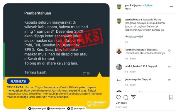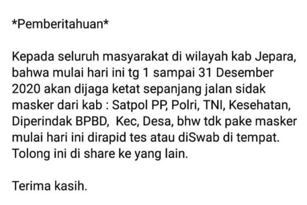 Beredar informasi bagi masyarakat Kabupaten Jepara soal sidak masker pada 1-31 Desember 2020 yang digelar sejumlah instansi Pemerintah Kabupaten Jepara. Informasi itu juga menyebut bila ada yang kedapatan tidak memakai masker maka harus menjalani rapid test atau swab test di tempat. Sejumlah akun Facebook mengedarkan informasi bahwa Pemkab Jepara akan menggelar sidak masker di sepanjang jalan pada 1-31 Desember 2020. Bagi warga yang tidak mengenakan masker, maka warga harus menjalani tes rapid atau tes usap di tempat. Salah satu akun pengunggah informasi itu yakni Mas Bejo. Berikut isi lengkap statusnya yang dilayangkan pada 2 Desember 2020: "*Pemberitahuan* Kepada seluruh masyarakat di wilayah kab Jepara, bahwa mulai hari ini tg 1 sampai 31 Desember 2020 akan dijaga ketat sepanjang jalan sidak masker dari kab : Satpol PP, Polri, TNI, Kesehatan, Diperindak BPBD, Kec, Desa, bhw tdk pake masker mulai hari ini dirapid tes atau diSwab di tempat. Tolong ini di share ke yang lain. Terima kasih."