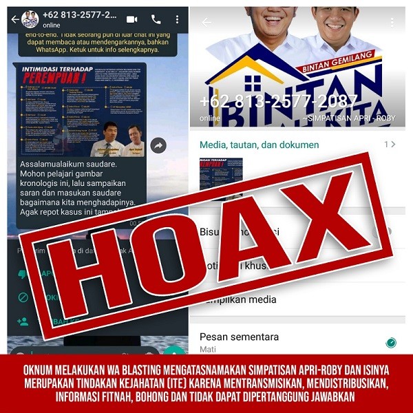 Beredar pesan berantai yang mengatasnamakan Pasangan Calon (Paslon) nomor urut 1 Kabupaten Bintan Apri Sujadi dan Roby Kurniawan yang menyebarkan pamflet berjudul "Intimidasi Terhadap Perempuan".