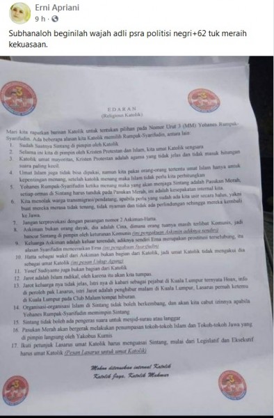 Beredar sebuah postingan dari akun Facebook Erni Apriani berupa sebuah foto surat edaran yang berisikan 17 poin klaim untuk mengajak umat Katolik untuk memilih pasangan nomor urut 3 Yohanes Rumpak-Syarifudin dalam Pilkada Sintang. Postingan ini diposting pada 7 Desember 2020 pada saat masa tenang Pilkada dan 2 hari sebelum Pilkada serentak. NARASI:“EDARAN(Religious Katolik)Mari kita rapatkan barisan Katolik untuk tentukan pilihan pada Nomor Urut 3 (MM) Yohanes Rumpak-Syarifudin. Ada beberapa alasan kita Katolik memilih Rumpak-Syarifudin, antara lain: Sudah Saatnya Sintang di pimpin oleh Katolik Selama ini kita di pimpin oleh Kristen Protestan dan Islam, kita umat Katolik sengsara Katolik umat mayoritas, Kristen Protestan adalah agama yang tidak jelas dan tidak masuk hitungan suara paling kecil. Umat Islam juga tidak bisa dipakai, namun kita pakai orang-orang tertentu umat Islam hanya untuk kepentingan menang, setelah katolik menang maka Islam tidak perlu kita perhitungkan