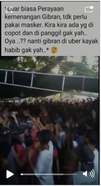 Beredar sebuah video memperlihatkan sejumlah orang berdesak-desakan tanpa masker di sebuah tempat. Video itu beredar melalui pesan berantai WhatsApp, baru-baru ini. Pada video itu terdapat narasi bahwa video itu terkait dengan Calon Wali Kota Solo, Gibran Rakabuming Raka. Berikut narasi selengkapnya: "Luar biasa Perayaan kemenangan Gibran, tdk perlu pakai masker. Kira kira ada yg di copot dan di panggil gak yah… Oya …?? nanti gibran di uber kayak habib gak yah…*