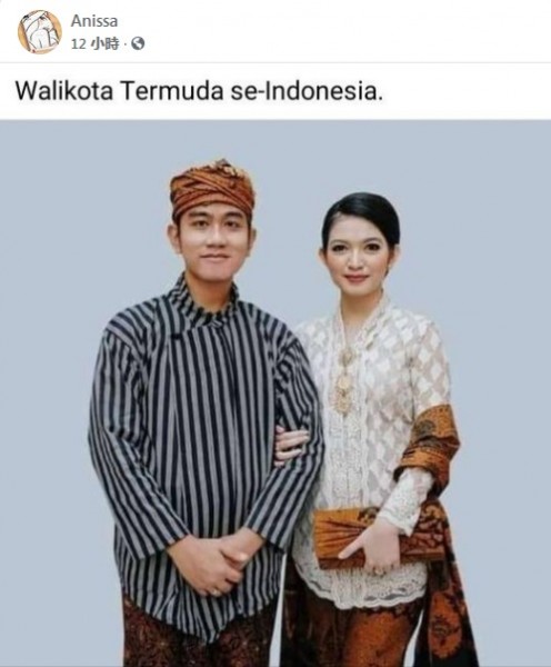Beredar di Facebook akun bernama Anissa memposting foto Gibran Rakabuming Raka dan Selvi Ananda dengan menyertakan klaim bahwa Gibran merupakan Wali Kota termuda se-Indonesia. Postingan tersebut diunggah pada grup INDONESIA BERSUARA pada 10 Desember 2020. NARASI:“Walikota Termuda se-Indonesia”