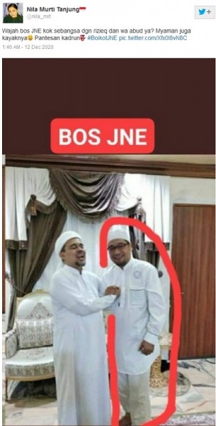 Beredar postingan foto di Twitter menunjukkan foto Rizieq Shihab bersalaman dengan seseorang yang diklaim sebagai Bos JNE. Beberapa postingan dengan klaim yang sama juga beredar di antaranya, https://archive.vn/w0upR, https://archive.vn/wo2g9, https://archive.vn/ybDeb. Klaim foto yang diduga Bos JNE bersama HRS beredar bersamaan dengan tagar #BoikotJNE serta ramainya media sosial atas peristiwa JNE dan FPI yang terjadi baru-baru ini. NARASI:“Wajah Bos JNE kok sebangsa dgn rizieq dan wa abud ya? Myaman juga kayaknya ???? Pantesan kadrun???? #BoikotJNE pic.twitter.com/Xfx0I8vN8C”(Tulisan dalam gambar)“BOS JNE”