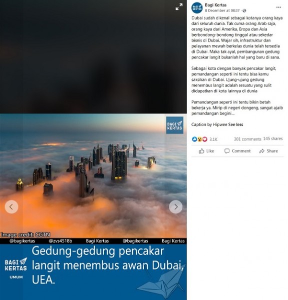 Beredar sebuah postingan dari akun Facebook Bagi Kertas berupa foto gedung pencakar langit yang diklaim menembus awan di Dubai, Uni Emirat Arab. NARASI:“Gedung-Gedung pencakar langit menembus awan Dubai, UEA.”