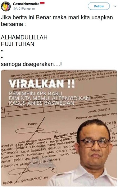 Akun Twitter GemaNawacita (@Ar01Pangeran) mengunggah narasi dengan foto surat yang di dalamnya terdapat kalimat bahwa pemimpin KPK baru diminta memulai penyidikan kasus Anies Baswedan. Narasi:“Jika berita ini Benar maka mari kita ucapkan bersama :ALHAMDULILLAHPUJI TUHAN••semoga disegerakan….!”Narasi dalam foto:“VIRALKAN!!PEMIMPIN KPK BARU DIMINTA MEMULAI PENYIDIKAN KASUS ANIES BASWEDAN”