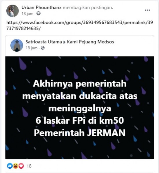 Beredar sebuah narasi Pemerintah Jerman mengucapkan dukacita atas meninggalnya enam anggota Front Pembela Islam (FPI) saat bentrokan dengan polisi di tol Jakarta-Cikampek. Narasi ini beredar di media sosial facebook. Akun facebook atas nama Urban Phounthanx membagikan narasi ini pada 22 Desember 2020. Ia mengunggah ulang dari akun facebook bernama Satrioasta Utama. Berikut narasi yang diunggah. "Akhirnya pemerintah menyatakan dukacita atas meninggalnya 6 laskar FPi di km50 Pemerintah JERMAN"Narasi ini beredar setelah kedatangan salah seorang diplomat Jerman ke markas FPI di Petamburan, Jakarta Pusat. Sekretaris FPI Munarman mengklaim kedatangan diplomat tersebut untuk mengucapkan dukacita.